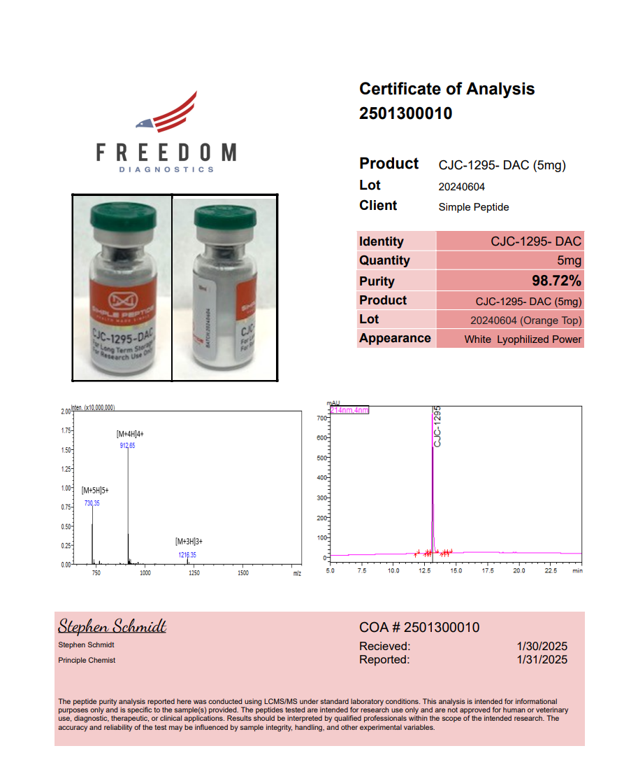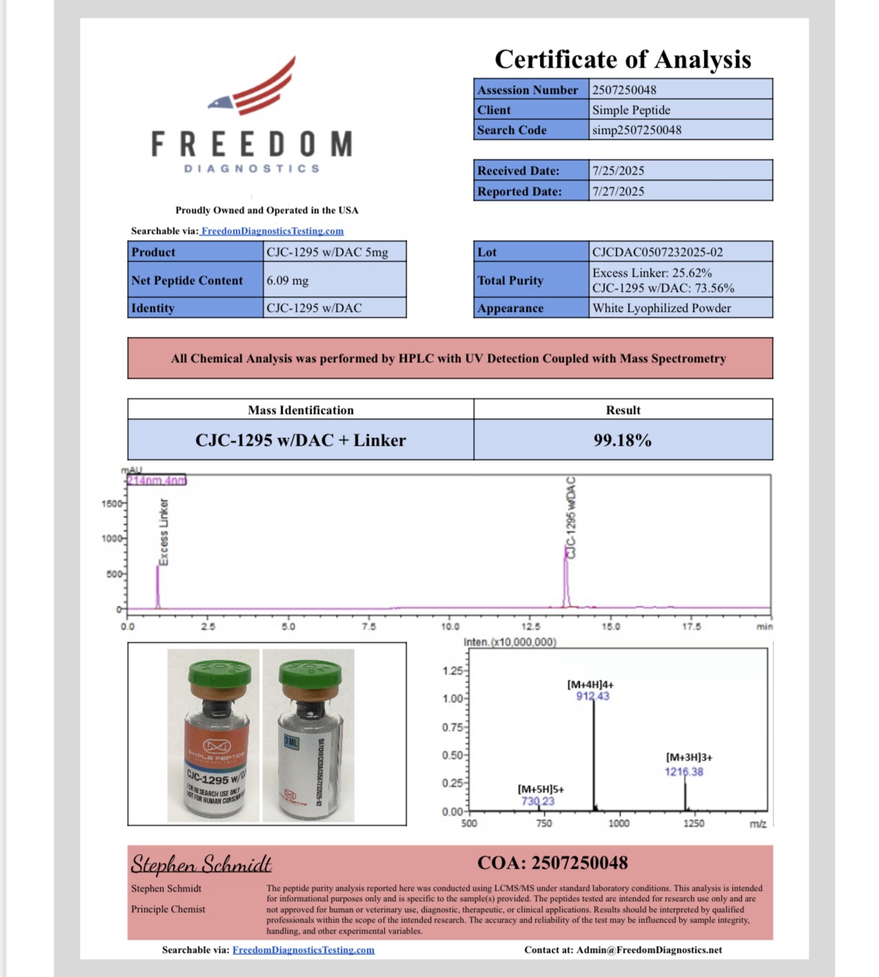 CJC-1295 w/ DAC 5MG, also known as DAC:GRF (short for drug affinity complex: growth hormone-releasing factor), is a synthetic analogue of growth hormone-releasing hormone (GHRH) (also known as growth hormone-releasing factor (GRF)) and a growth hormone secretagogue (GHS).  CJC-1295 w/ DAC consists of the same 29-amino acid peptide backbone as CJC-1295 w/o DAC but includes an additional chemical modification known as the Drug Affinity Complex (DAC). The DAC allows the peptide to covalently bind to serum albumin, dramatically extending its half-life up to 8 days.