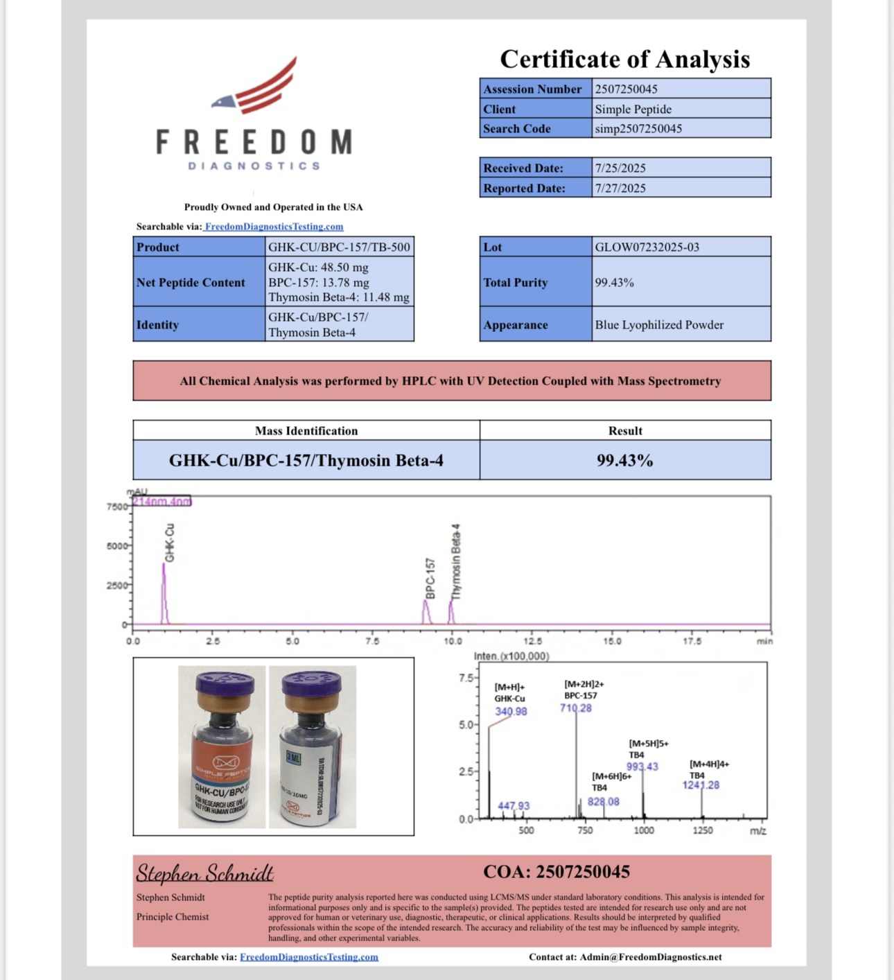 All products are shipped in lyophilized or original powder form and must be reconstituted to a liquid for research and testing. This blend comes from a GMP-compliant facility located in the USA with a purity level of ≥99%. Furthermore, it is supplied as lyophilized powder, which ensures long shelf life and stable quality. After reconstitution, researchers should refrigerate the solution and use it within 90 days to maintain effectiveness. We are unable to provide any instructions or guidance on dosing research.