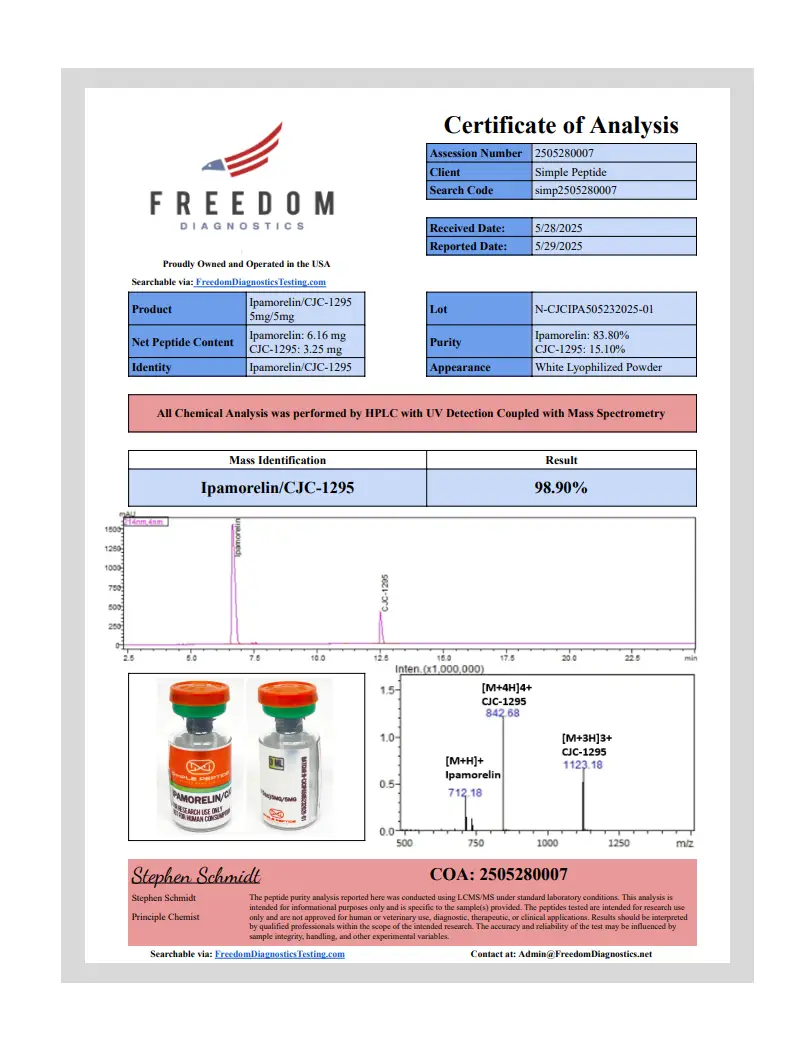 Ipamorelin/CJC-1295 (no DAC) at a 5MG/5MG concentration is a lyophilized powder blend developed for research applications. This combination provides a stable and reliable compound for laboratory studies focusing on growth hormone (GH) pathways.